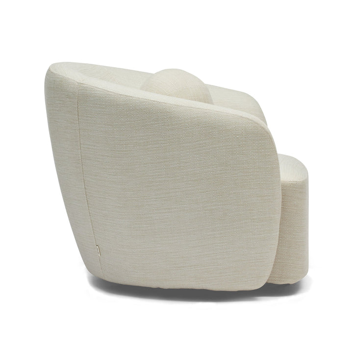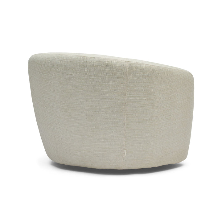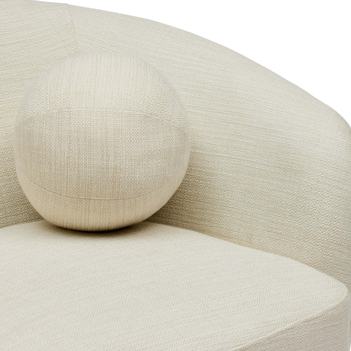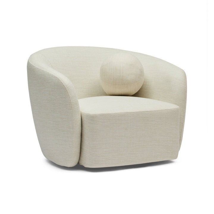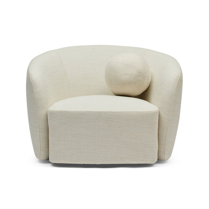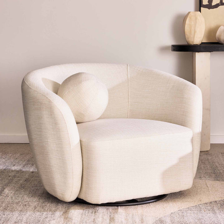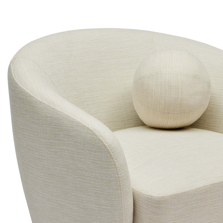 The Albi Occasional Chair with Ball Cushion - this stylish swivel is furniture to be lived in and loved. Add a modernist touch to any space with this chic and cozy chair which includes matching ball cushion. Upholstered in textured cream weave fabric & with invisible swivel base, this stunning occasional chair with a modern silhouette feels slightly vintage and totally high end. The generous proportions allow a soft luxurious feeling and the minimal, curved shape is perfect for a calm and relaxed living room or bedroom.