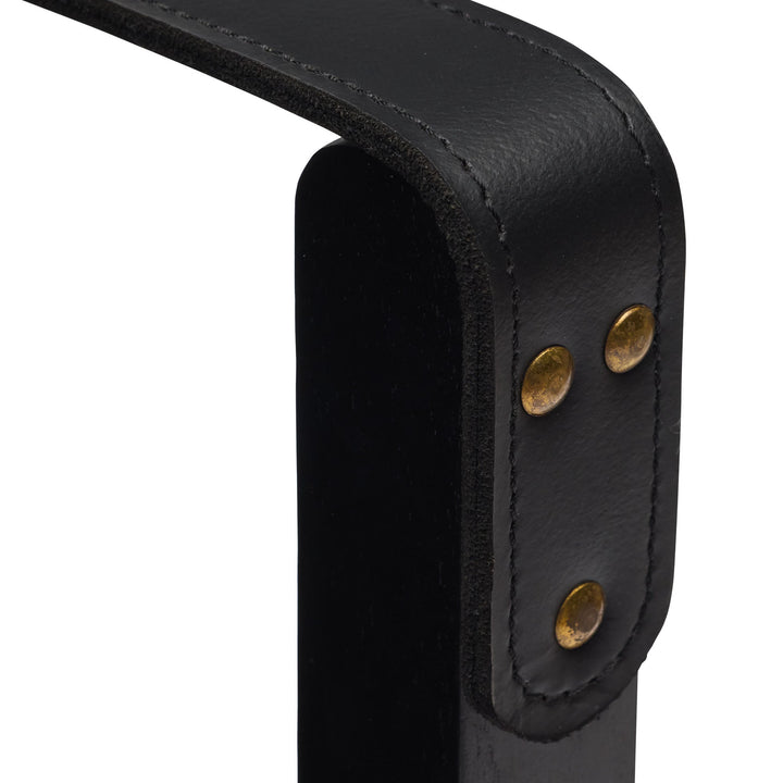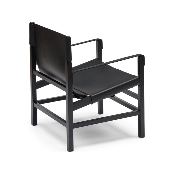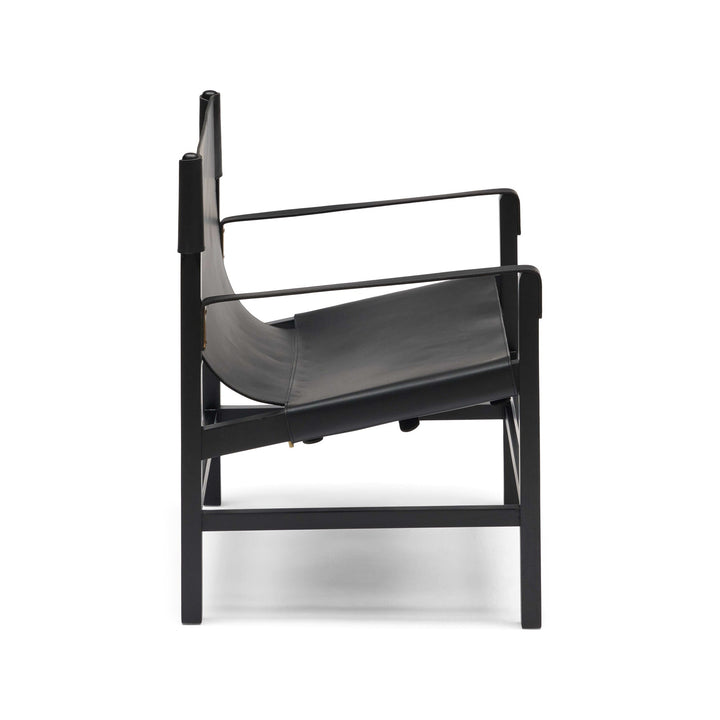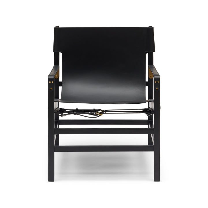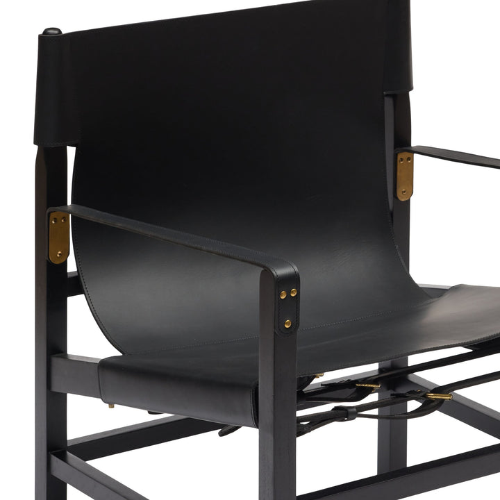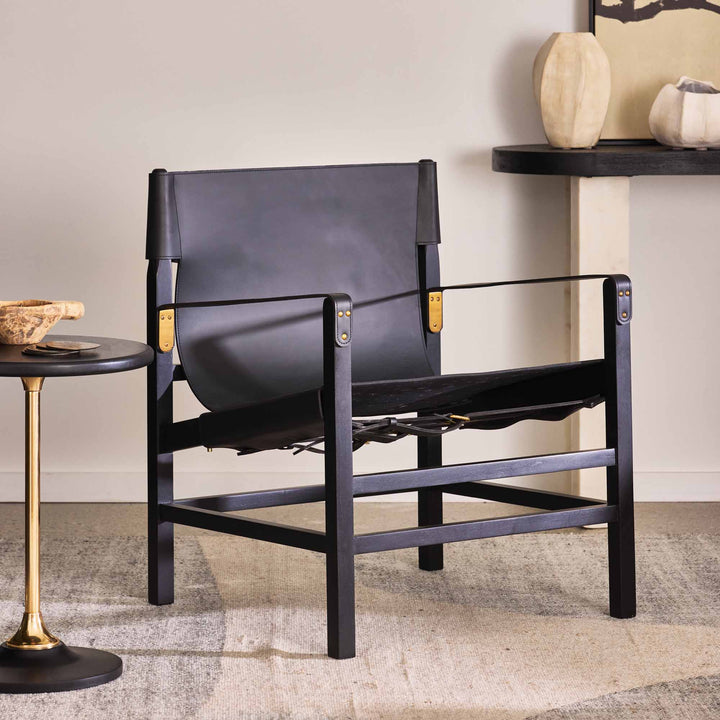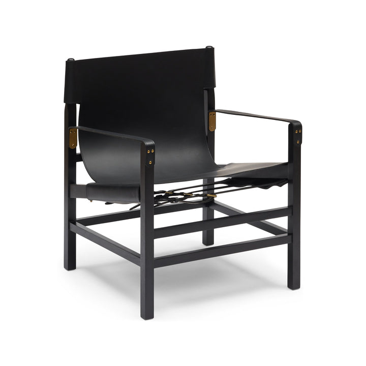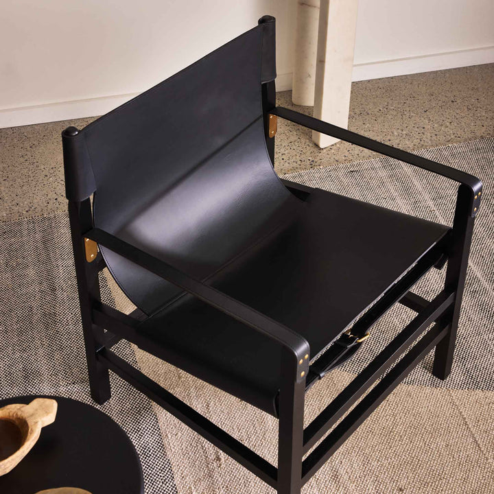 The Aldo Armchair sports a relaxed yet sophisticated design. Crafted from black leather & black stained timber, this armchair features a laidback leather-sling seat supported by a sturdy frame. Exuding understated elegance & comfort, the subtle detailing of buckles & brass accents add a touch of refinement to its well-constructed appearance. Relax in the soft, supple leather seat while admiring the safari-inspired aesthetic. The Aldo is designed for style & functionality, with a character that is timeless yet contemporary. Given the handmade nature, slight variations are to be expected. Remember leather is an organic material that will soften & develop unique characteristics over time.