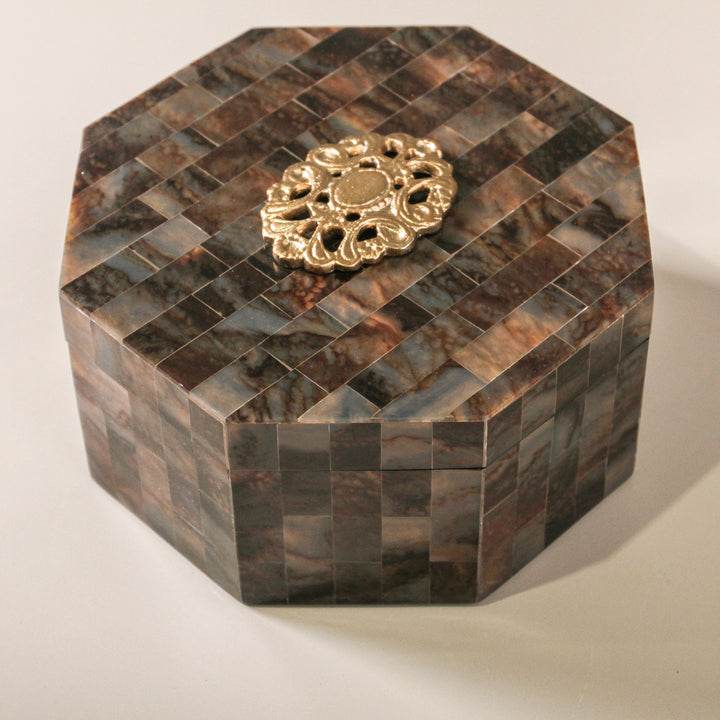 A piece of quiet opulence, the Amber Decorative Box is defined by its rich palette and thoughtful craftsmanship. Composed of hand-laid rectangular inlays of resin in tones of dark amber, tobacco, and burnished brown—each facet echoing the warmth of aged stone or glowing resin.
