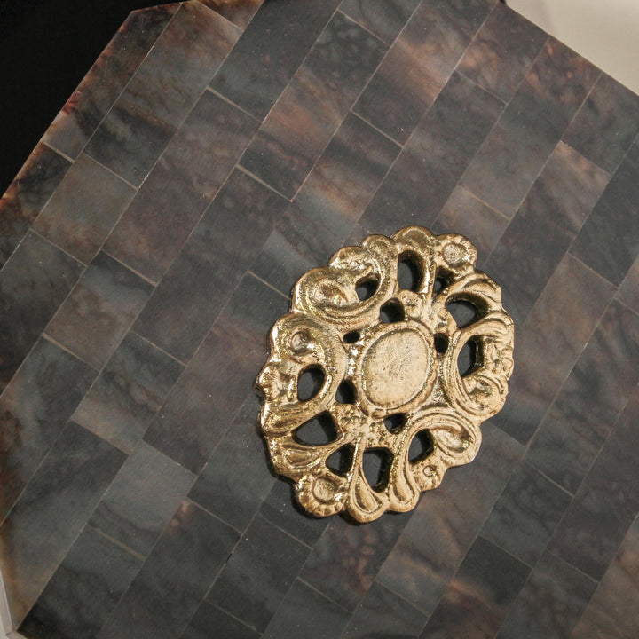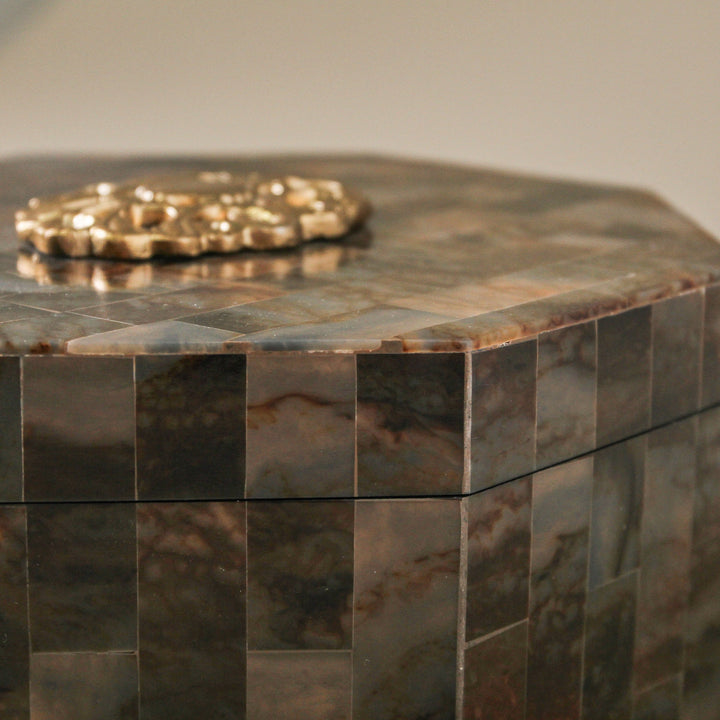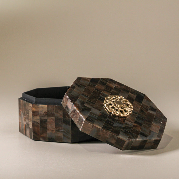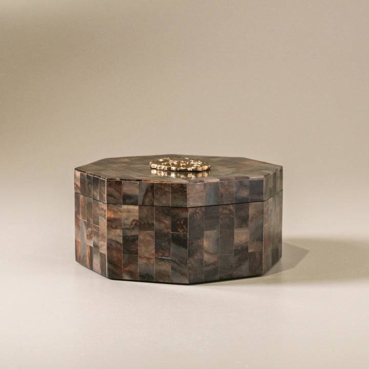 Shaped into a soft octagon, the box is crowned with a golden metal ornament— this detail adds a delicate shimmer and a touch of old-world refinement. Perfect for holding jewellery, mementoes or simply admired as a sculptural accent. Amber Box is a beautifully grounded piece for dressing tables, consoles, or styled shelves.