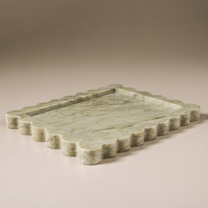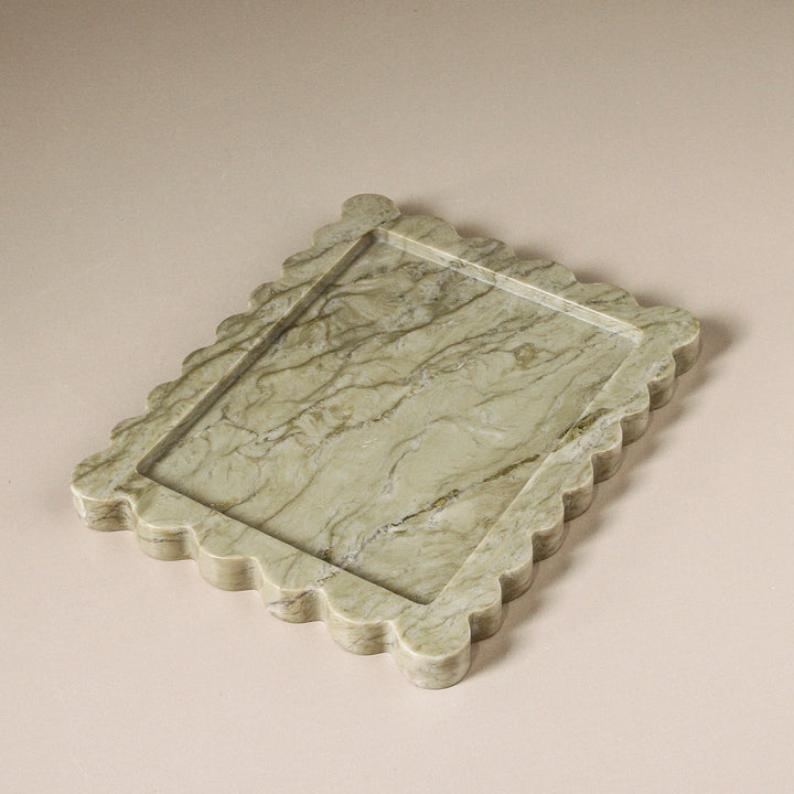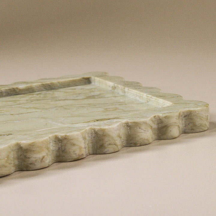 The Arabesque Tray is designed for those who value thoughtful design and timeless materials. With its rectangle proportions and scalloped edging, it brings a harmonious balance of shape and texture. Available in two refined finishes—deep Brown Emperador and cooling Mint marble—this tray becomes a quiet statement wherever it's placed. Ideal for grouping daily-use items or elevating decorative objects, Arabesque brings a sense of curation and calm to any vignette. A versatile piece from the Tender Forms collection, it’s perfect for those creating interiors with softness, contrast, and natural beauty. Arabesque’s rounded-edge square shape and rich natural stone make it an ideal base for layered styling. Use it to group candles, jewellery, or incense bowls for a thoughtful vignette. The scalloped edges add a sculptural touch that blends seamlessly into organic, coastal, or modern interiors.