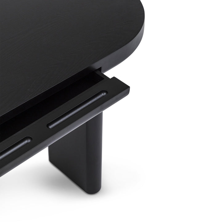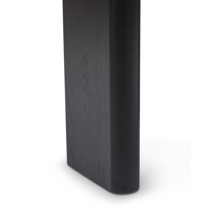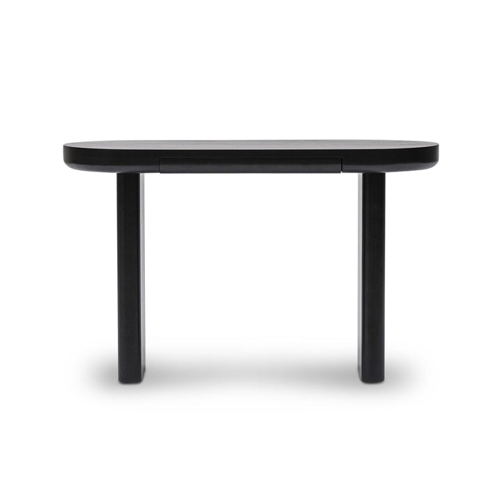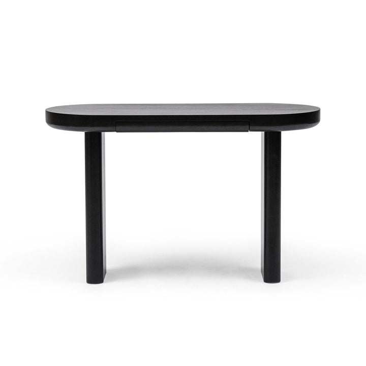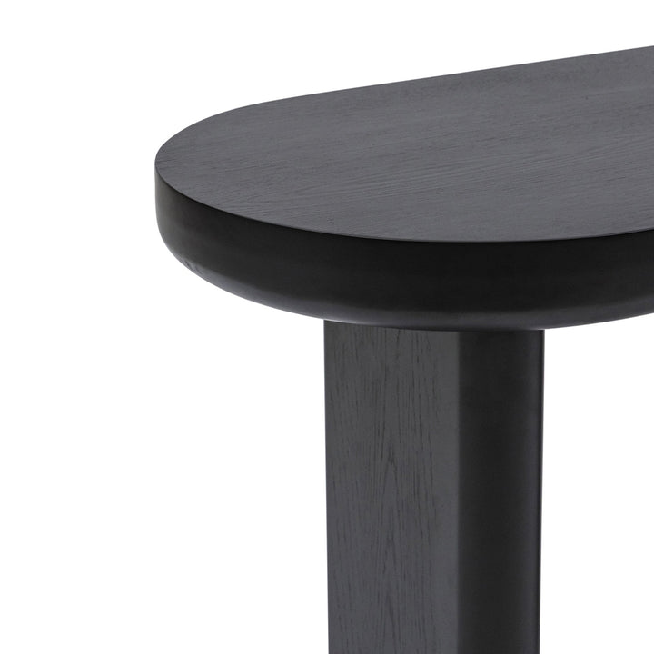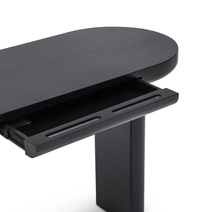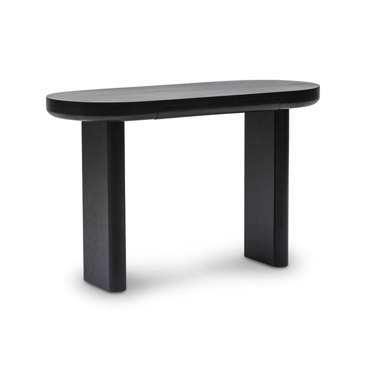 The sleek oval design of Arcus Console brings a modern minimalist touch to any interior. Crafted from durable MDF with an oak veneer and black painted finish, it features a slimline drawer for handy storage and a tabletop set on two narrow legs with softly curved edges, creating a balanced play of straight and rounded lines. Subtle wood grain texture enhances its refined simplicity, making this console a timeless piece that is as practical as it is stylish.