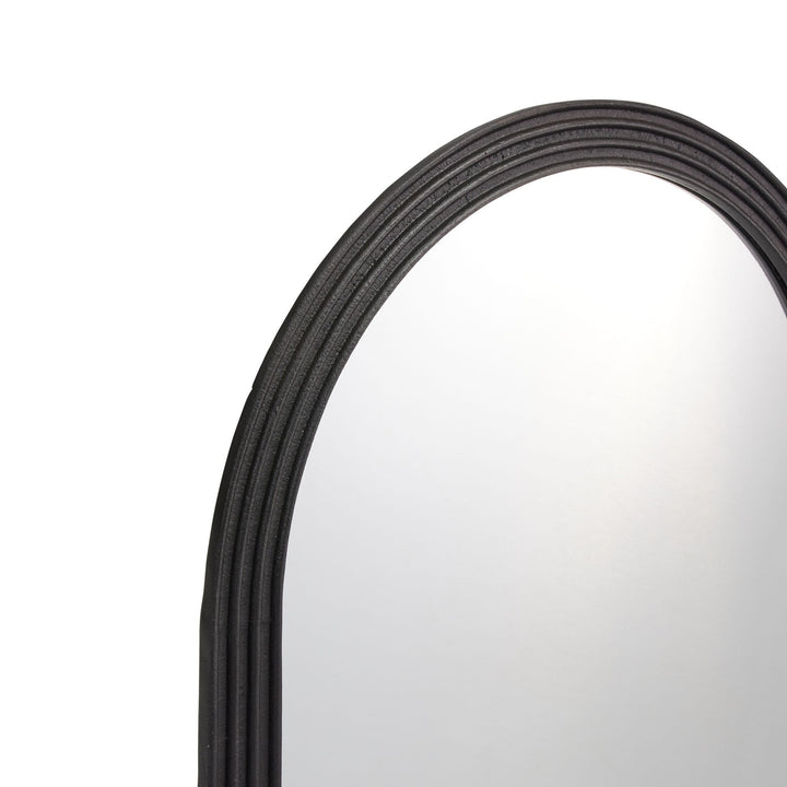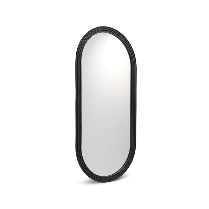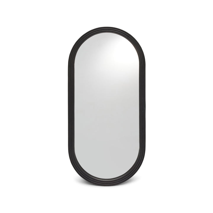 The Ascot Mirror, this oval wall mirror with a ridged frame in matte bronzed black metal will change the atmosphere of your whole room instantly. Perfect for modern contemporary living & will make a statement in living areas, bedrooms & hallways. Shipped ready to use. Fixtures on the rear of the mirror are to hang vertically only. The mirror is fitted with D-rings for direct hanging. DIMENSIONS Height: 129 cm Length: 63 cm Width/Depth: 3 cm Frame width: 5 cm SPECIFICATIONS Weight: 25 kgs Material: Mirrored glass with aluminium frame & mdf backing WARNING: under no circumstances should cord or wire...