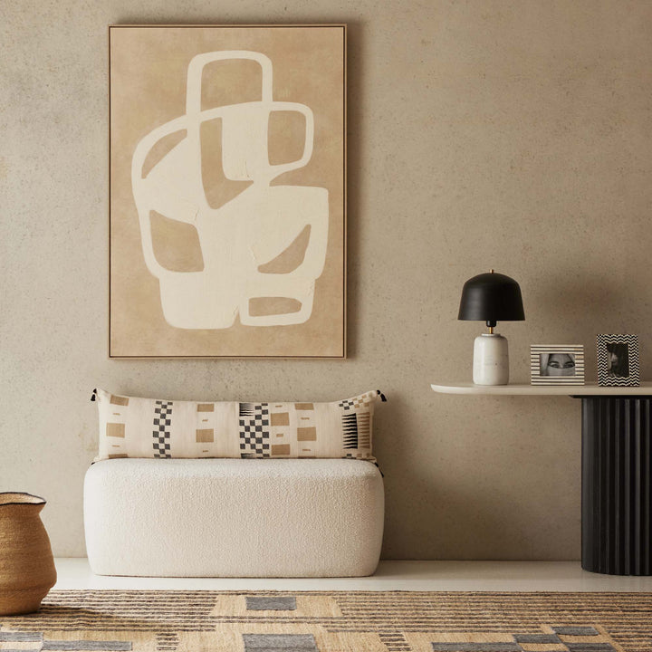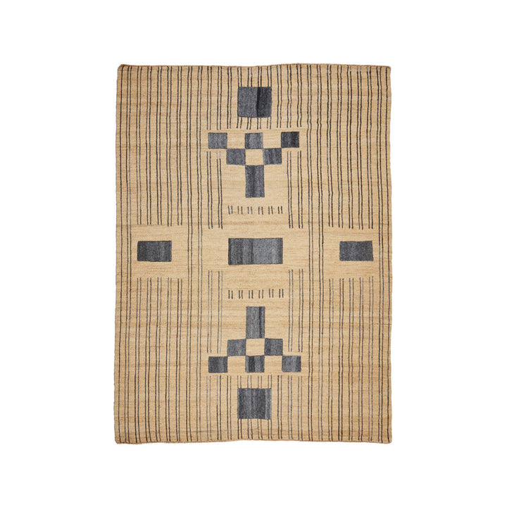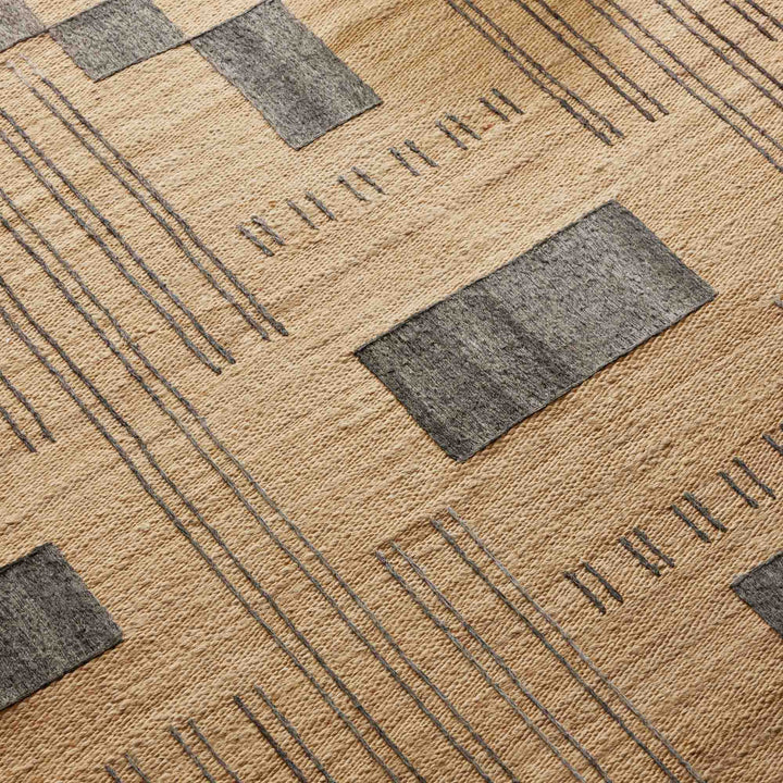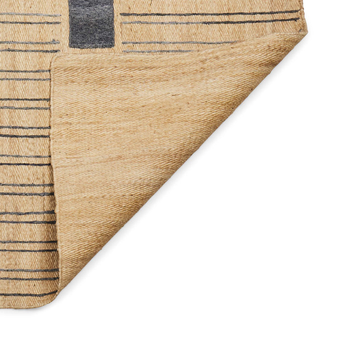 The Aspen jute floor rug in natural with black embroidery. Hand woven from natural fibres, this rug boasts textural elements with a geometric linear design. The Aspen is a durable accent rug that seamlessly adapts to different rooms. With a low-pile, this durable floor rug is great for dining room, living room or other high traffic. Easy to maintain, the Aspen Rug will be a standout piece wherever used & cherished for years to come. Due to the handmade process & limited production, each piece is unique with slight variations.
