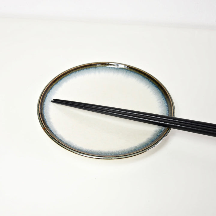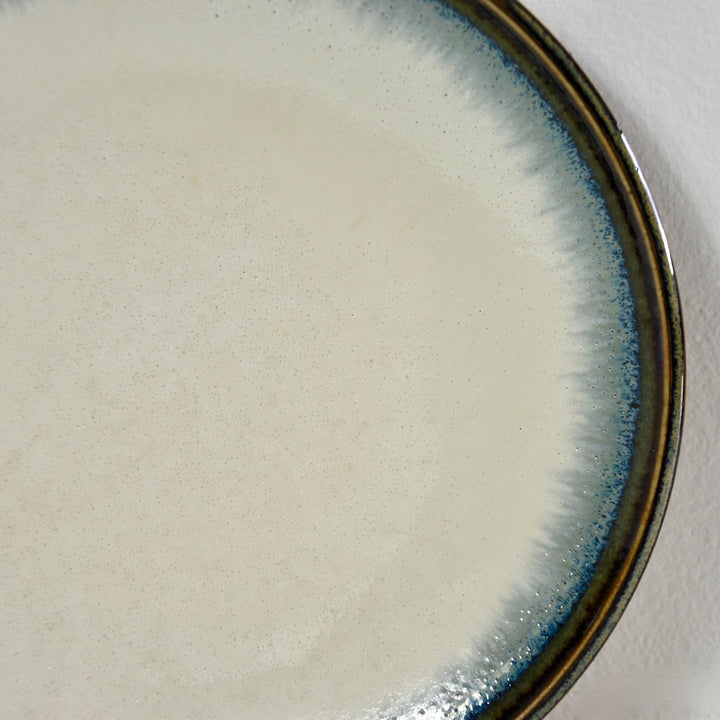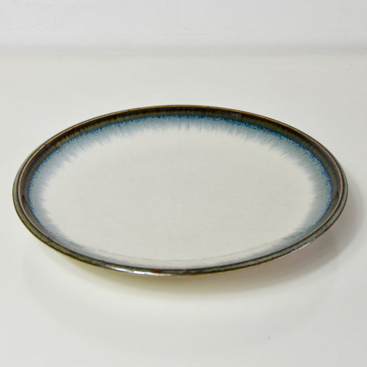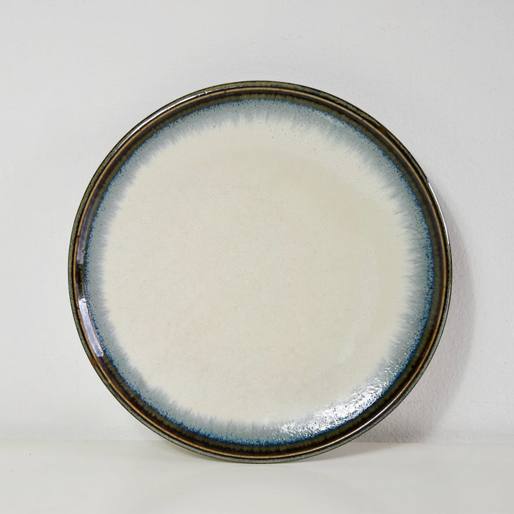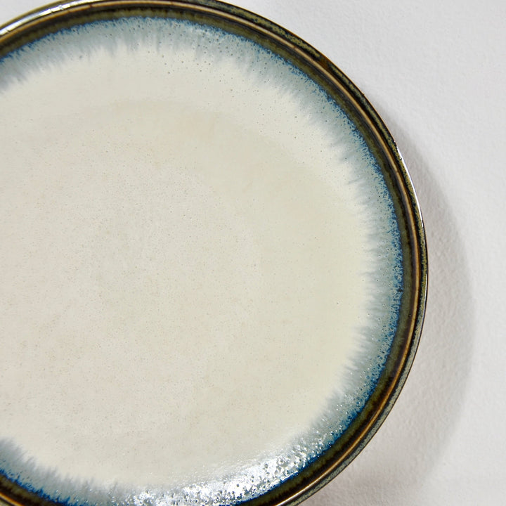 A compact tapas plate with a smooth surface and subtle rim. Perfect for tapas, sides, or small servings. The Aurora glaze has a smooth finish that shifts from brown at the edge to sky blue, then to a clean white centre. The colour transitions are subtle, with a slight speckled texture around the sky blue area. Slight irregularities in size, glaze and texture reflect the artisan nature of the product and are embraced.