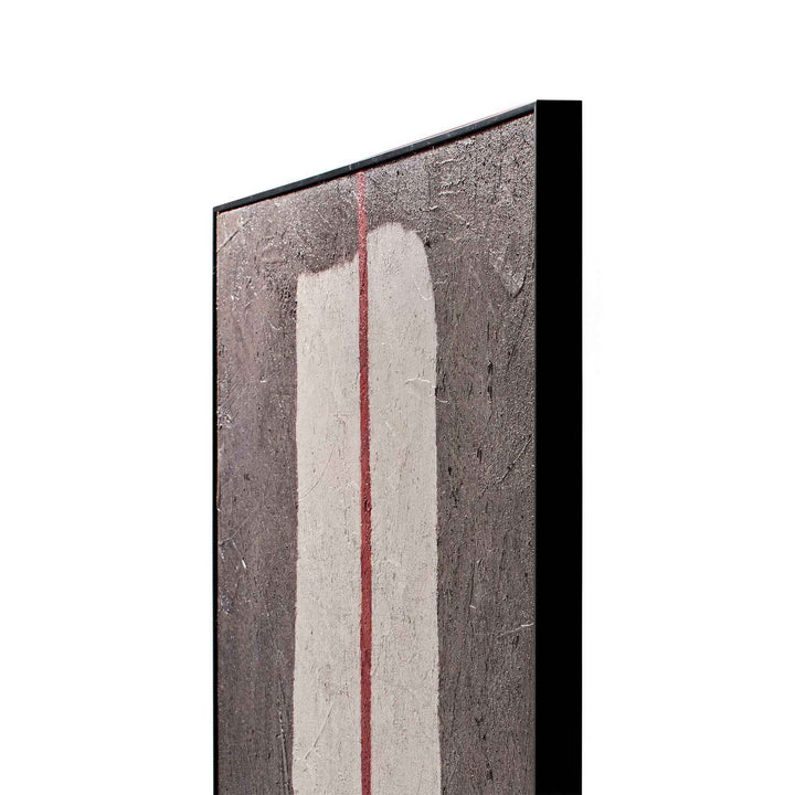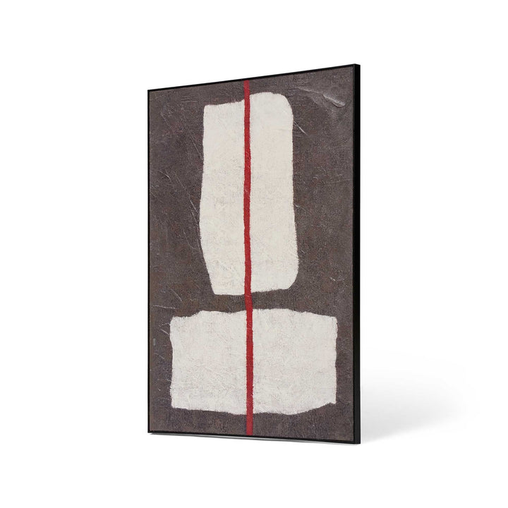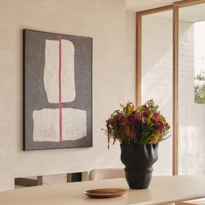 Set the tone of your room from the walls out with the Baski Framed Wall Art. Featuring a modern abstract design in black and white, accented by a bold red stripe, this textured piece is painted on hessian canvas and finished with a sleek black PS timber frame & fitted with D-ring hangers for secure installation. Do not use metal wire or string to create a centre point to hang the artwork. Always hang using both D-rings in an upright position and refer to the included instructions to ensure correct installation and prevent damage to the fittings or artwork.