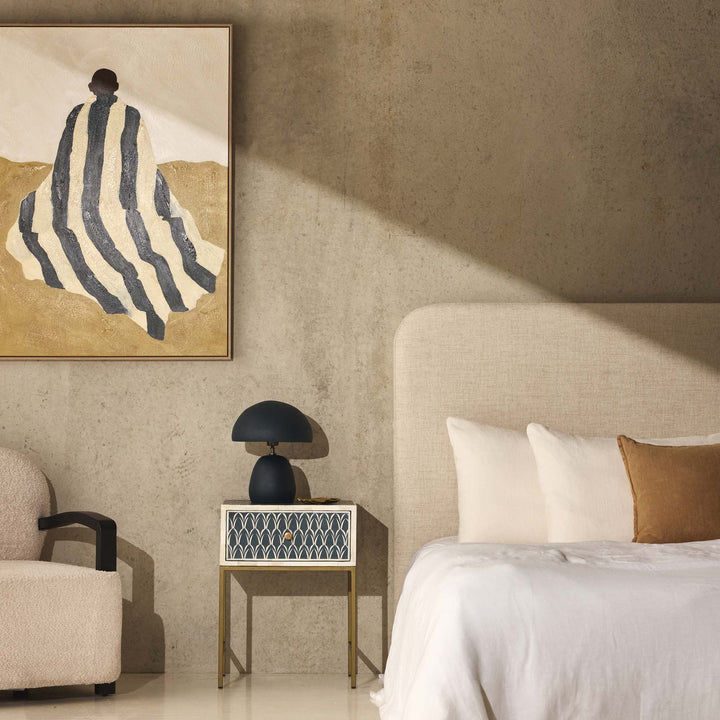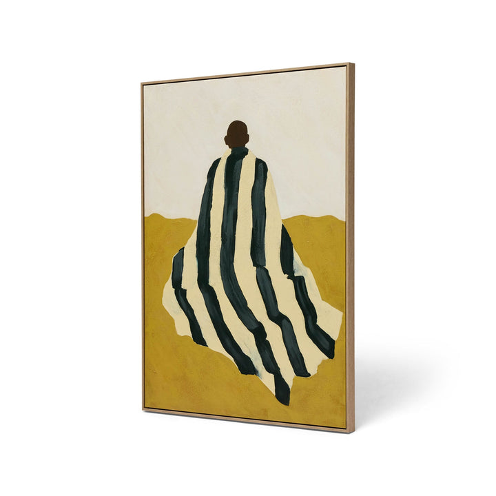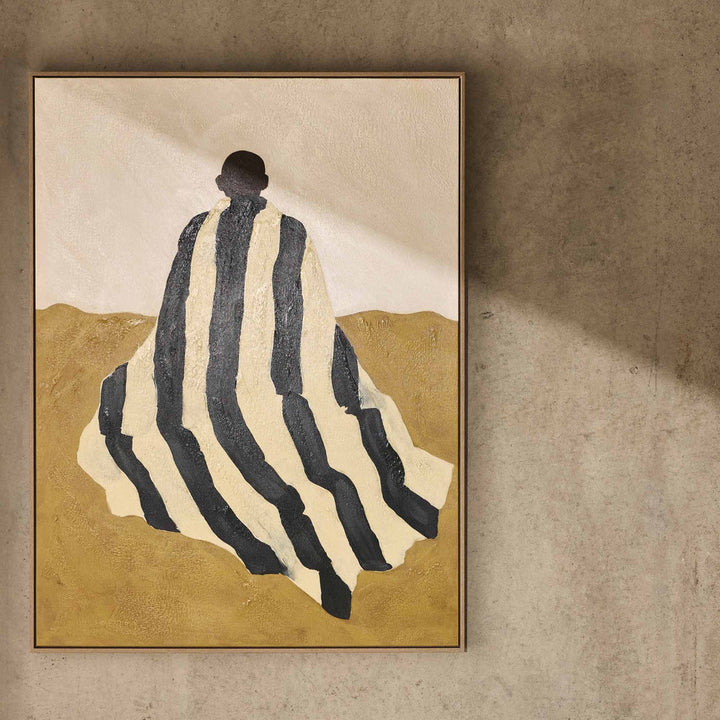 Our Bon Wall Art is a captivating hand-painted piece on canvas, portraying a figure in a striped coat amidst serene sand dunes. The backdrop of warm coloured hues harmoniously combine with the black striped motif, creating a tranquil and reflective scene. Its striking yet balanced visual appeal effortlessly complements both modern and classic interiors. Complete with a D-ring hanger on the rear, this artwork is poised to adorn your walls with a harmonious and calm sophistication.