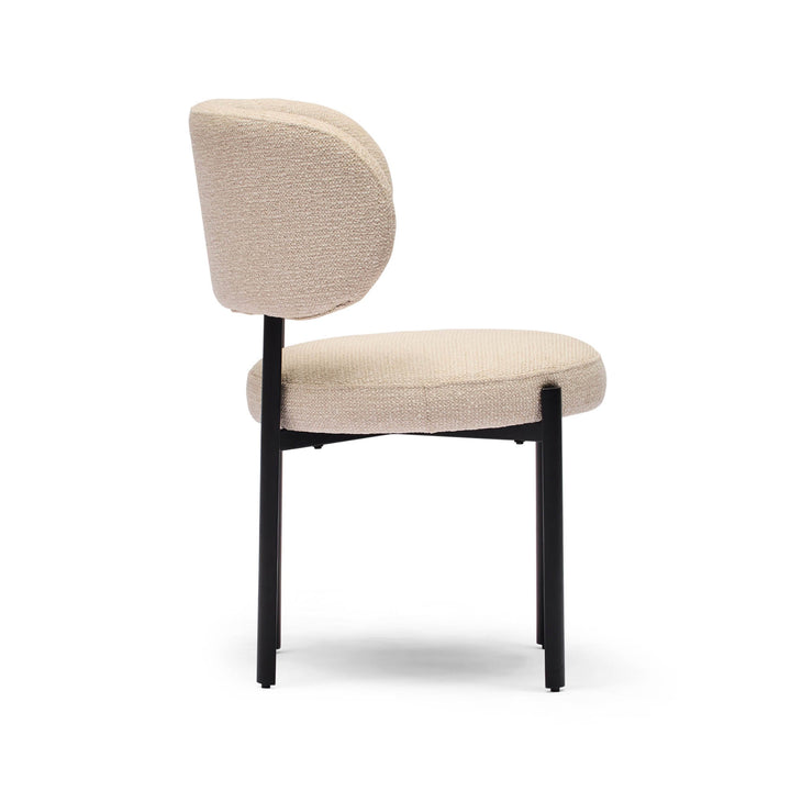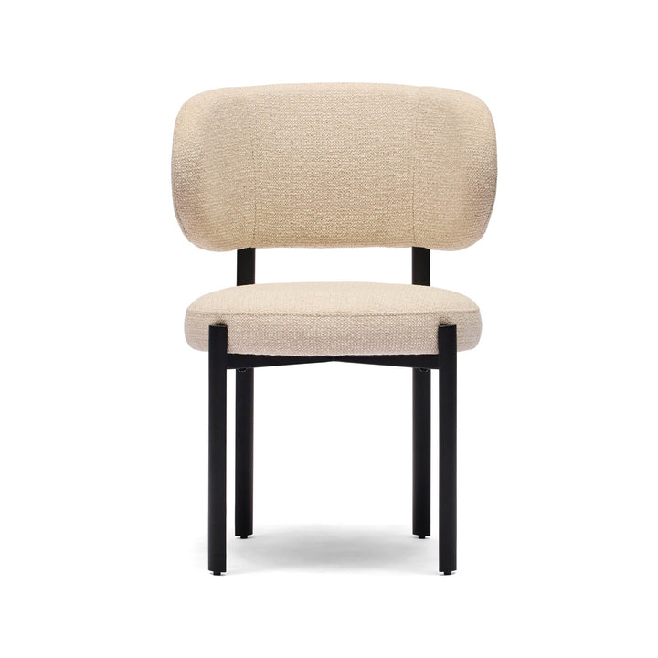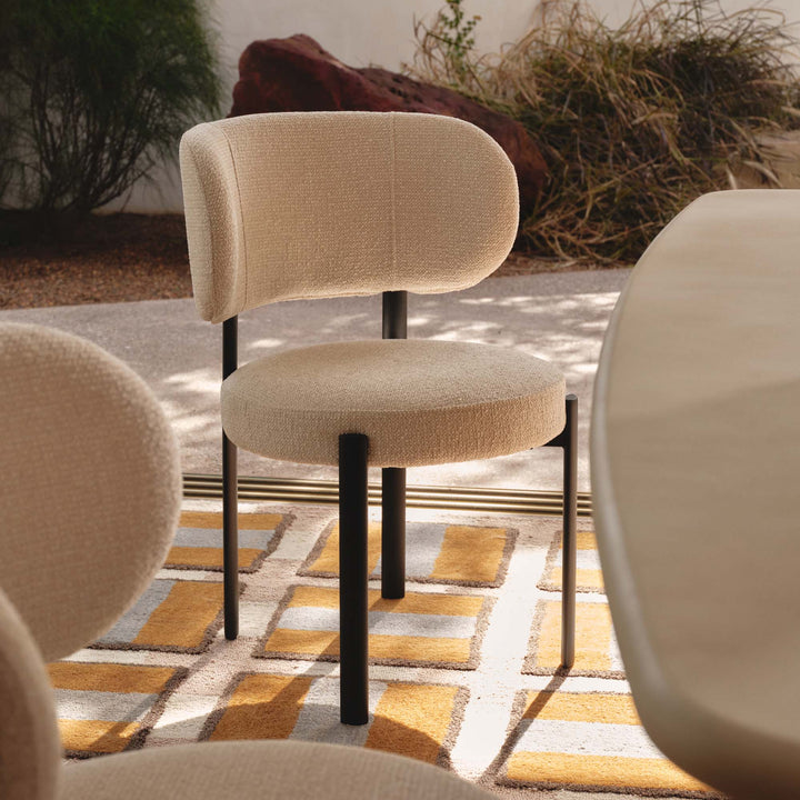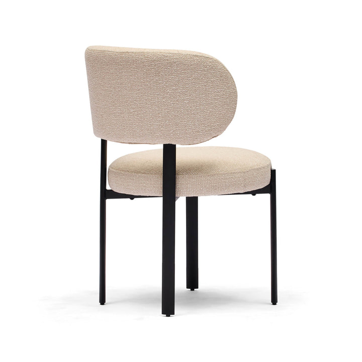 The Caden Dining Chair blends beauty and comfort, making it a perfect choice for any contemporary dining space. Its broad, curved backrest and well-cushioned seat provide exceptional support, while the textured weave upholstery in light beige adds warmth and sophistication. The sleek, black metal frame creates a striking contrast, enhancing its modern appeal. With its minimalist design, the Caden effortlessly complements both new and existing dining tables.