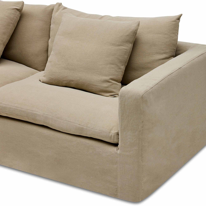 The Cape Modular Sofa offers versatile comfort with a timeless, relaxed design. Featuring a feather and foam-filled seat and cushions, a solid timber frame, and a serpentine spring base, it provides the perfect balance of softness and support. The 3-seat sofa with matching ottoman allows for left- or right-hand configuration to suit your space. Upholstered in warm stone coloured fabric with fully removable covers for easy cleaning, the Cape is designed for effortless living, adapting to your needs while bringing harmony and comfort to any space.