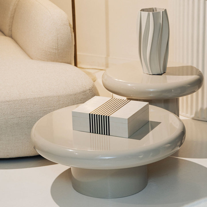 The Carter Coffee Table Large showcases a sleek, rounded silhouette, featuring a generously thick tabletop set on a bold cylindrical plinth base. Crafted from a sturdy timber frame and finished in a high-gloss lacquer, it highlights smooth, rounded edges and a polished surface that reflects modern elegance. Versatile and stylish, this statement piece is ideal for the home, office, or venue, offering endless potential for styling to suit your personal taste.