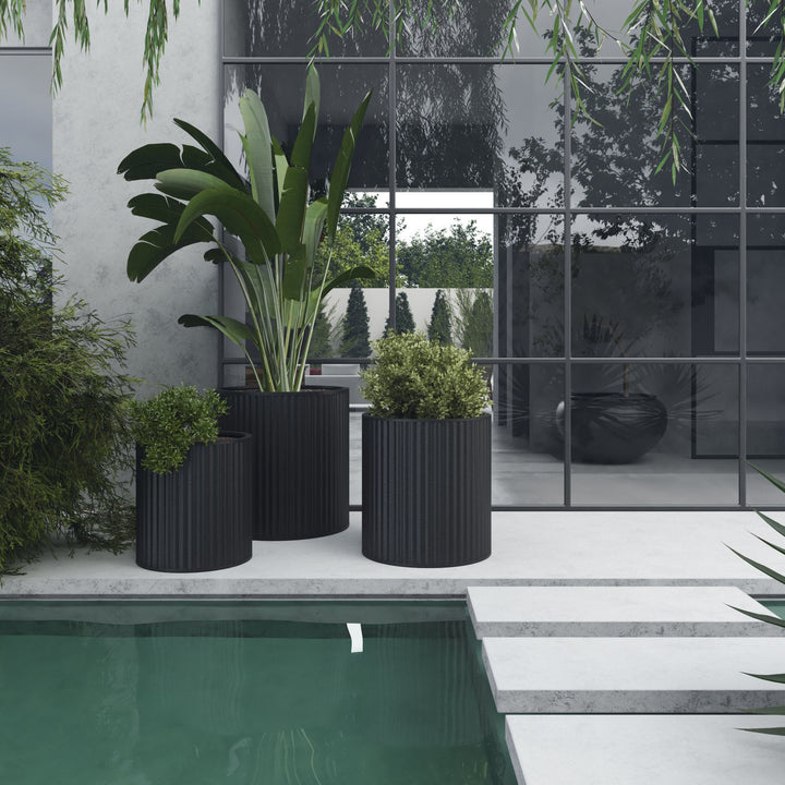The Cayman Planter Medium in Matte Black. These tree pots are made from durable & long-lasting glass fiber reinforced concrete & sealed on inner & outer surfaces. These watertight planters can also be used indoors & have drain holes with plugs. The oxidised finish will lead to variations in colour overtime. Width of planter opening is 58 cm (medium).