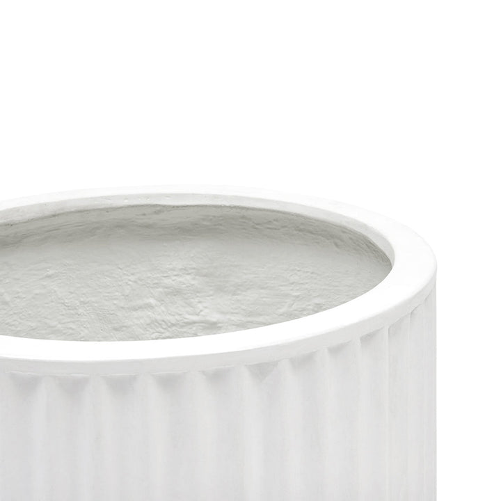 The Cayman Planter Small in White. These tree pots are made from durable & long-lasting glass fiber reinforced concrete & sealed on inner & outer surfaces. These watertight planters can also be used indoors & have drain holes with plugs. The oxidised finish will lead to variations in colour overtime. Width of planter opening is 48 cm (small).DIMENSIONSSmall: Height 61 cm Diameter: 57 cmSPECIFICATIONS Weight (Small): 31 kg Width of opening (Small): 48 cm These glass fiber reinforced concrete products are moulded & sprayed in the concrete material. The production process maintains the same thickness application however the characteristics in...