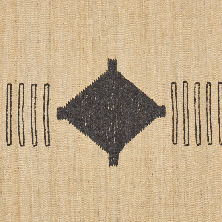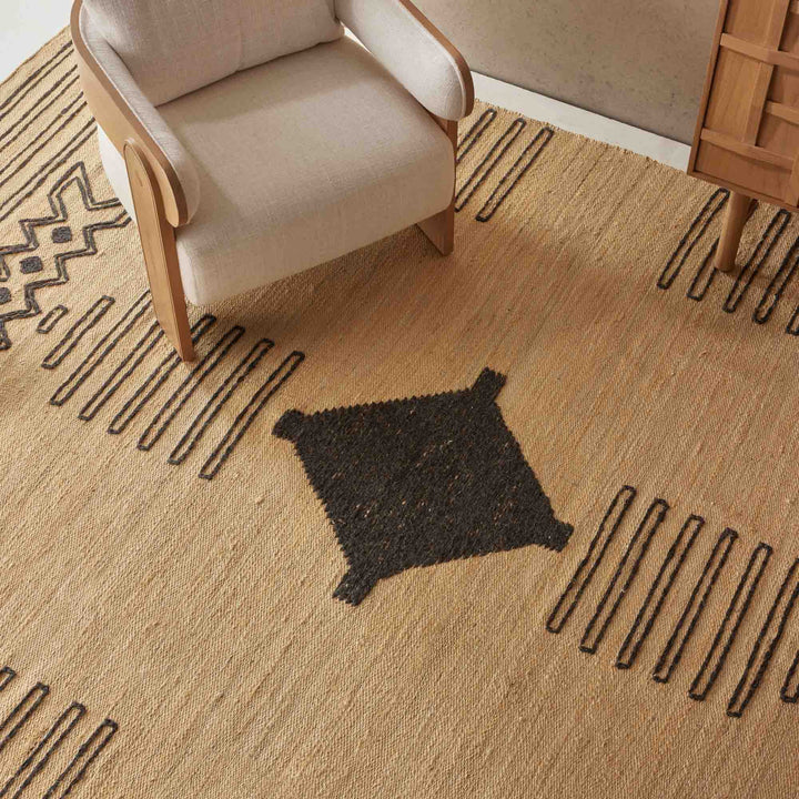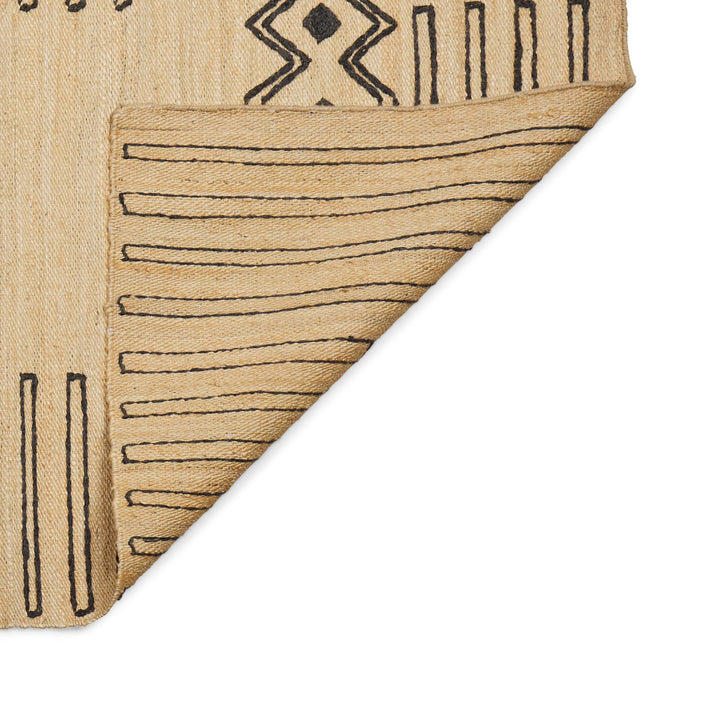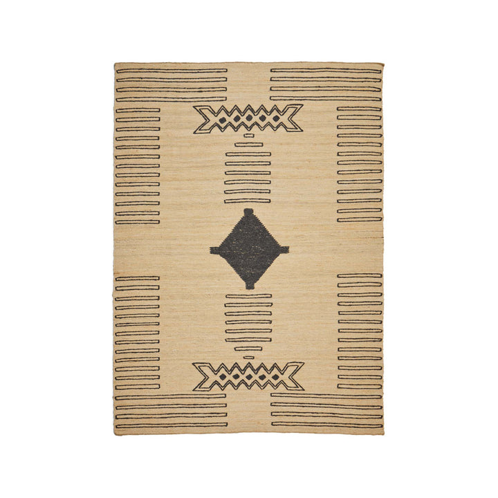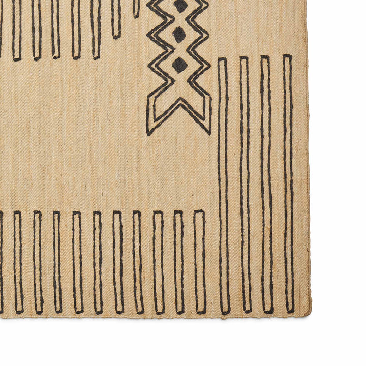 The Celeste jute floor rug in natural with black embroidery. Hand woven from natural fibres, this rug boasts textural elements with a geometric linear design. The Celeste is a durable accent rug that seamlessly adapts to different rooms. With a low-pile, this durable floor rug is great for dining room, living room or other high traffic. Easy to maintain, the Celeste Rug will be a standout piece wherever used & cherished for years to come. Due to the handmade process & limited production, each piece is unique with slight variations.