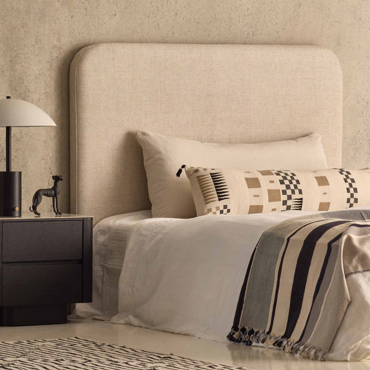 The Celine Bedhead in ivory is a classic style bedhead with softly curved edges. This beautiful double size bedhead is upholstered in a cream colour linen blend fabric. Cushioned for comfort, it will add a contemporary and luxurious flair to your room. This bedhead will suit a standard double size bed. Wall mounts/brackets are included.