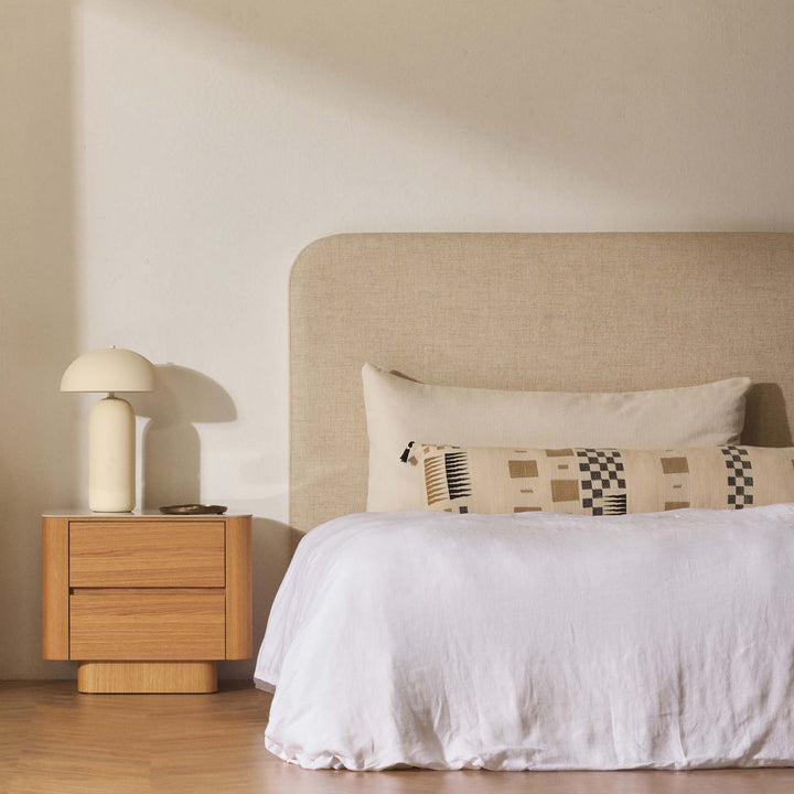 The Celine Bedhead in ivory is a classic style bedhead with softly curved edges. This beautiful queen size bedhead is upholstered in a cream colour linen blend fabric. Cushioned for comfort, it will add a contemporary and luxurious flair to your room. This bedhead will suit a standard queen size bed. Wall mounts/brackets are included.