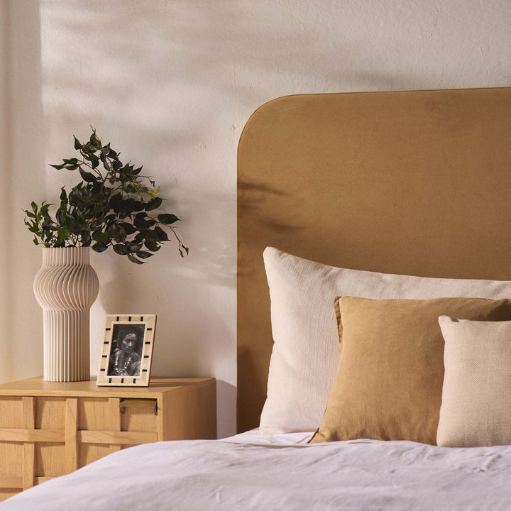 The Celine Bedhead in Sand is a classic style bedhead with softly curved edges. This beautiful queen size bedhead is upholstered in a plush sand coloured velvet. Cushioned for comfort, it will add a contemporary and luxurious flair to your room. This bedhead will suit a standard queen size bed. Wall mounts/brackets are included.