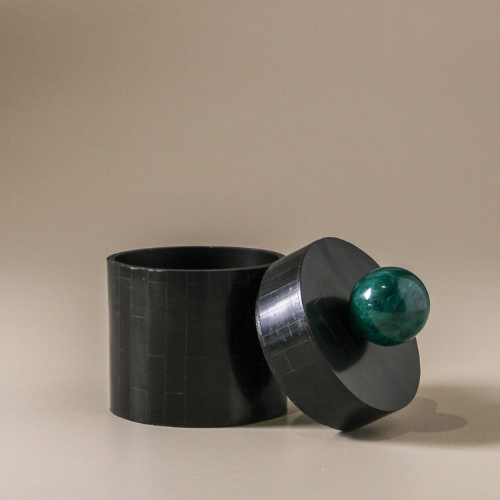 Sculptural and striking, the Clea Canister is a modern vessel imbued with quiet drama. Its cylindrical form is cast in deep black resin—smooth, seamless, and grounding—while a single emerald-green orb crowns the lid, jewel-like in its simplicity.