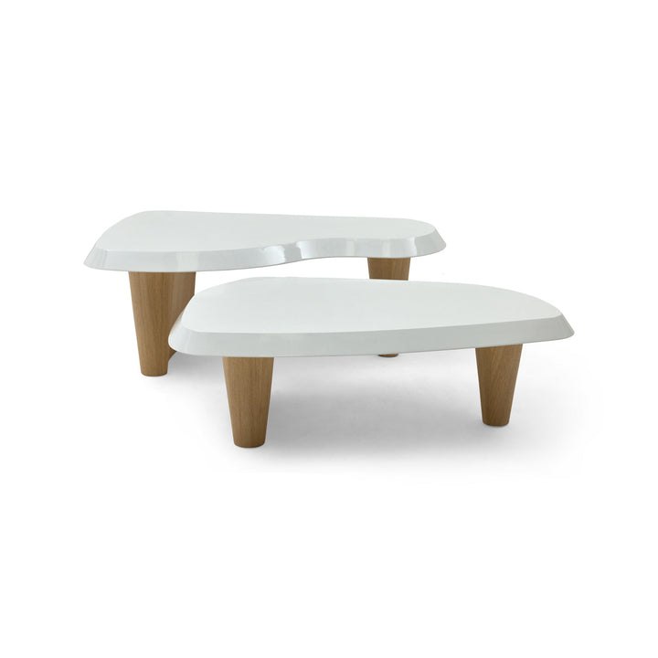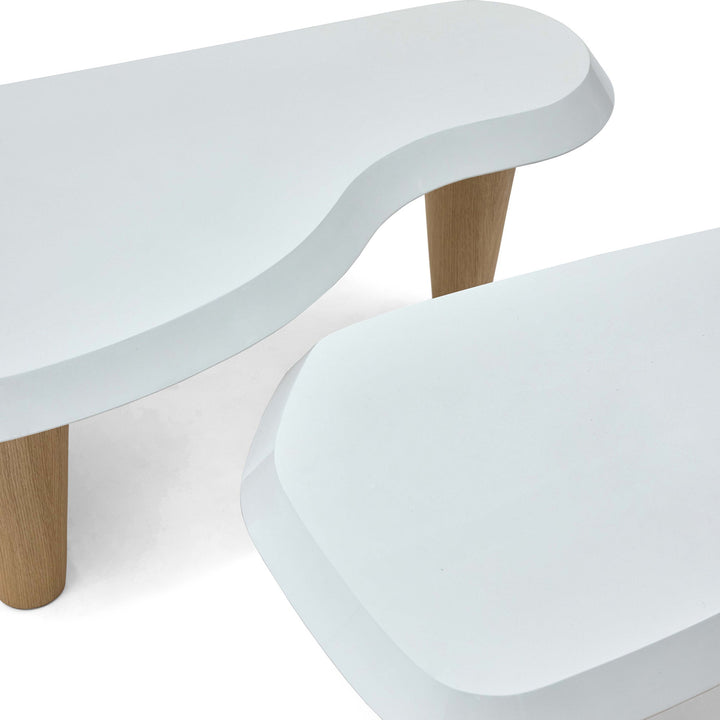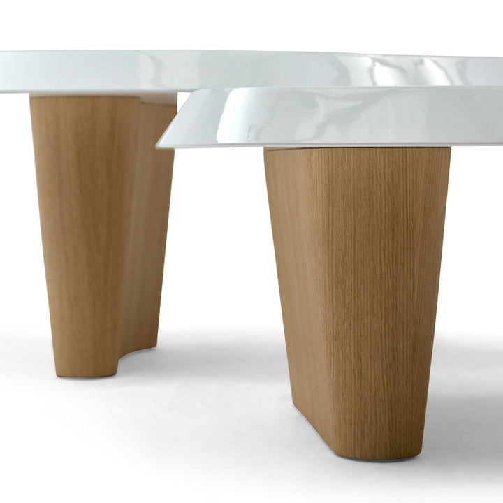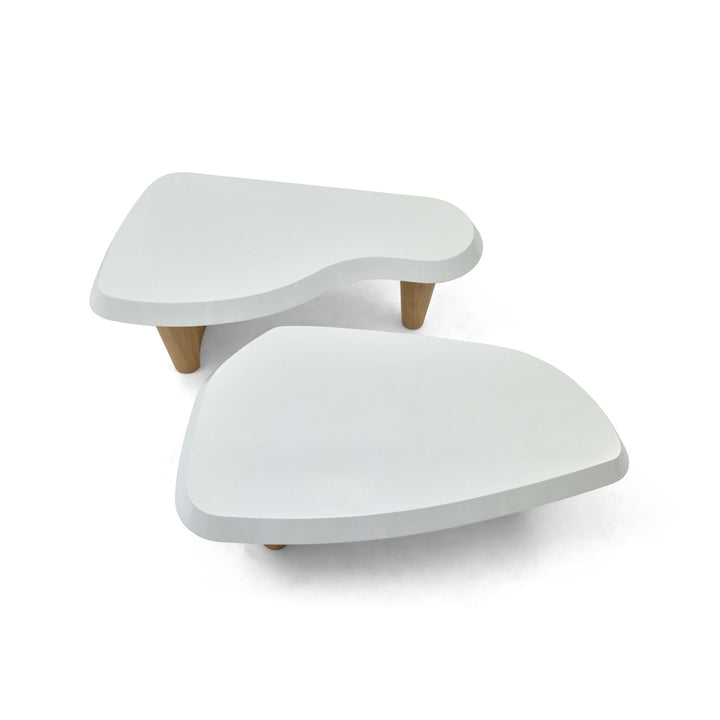 SET of 2. The Copenhagen Nesting Coffee Tables Sample Set blends simple lines with classic inspiration to deliver a timeless yet contemporary look. Both tables are finished in a crisp white satin lacquer and warm natural oak, the set showcases exceptional craftsmanship and high-end design. Sculpted solid oak legs highlight the natural beauty of the timber, while the elegant, curved forms of the tables create a striking sculptural presence when styled together. Whether nested or placed apart, they serve as a sophisticated anchor point for any living space showcasing innovative design and enduring appeal.