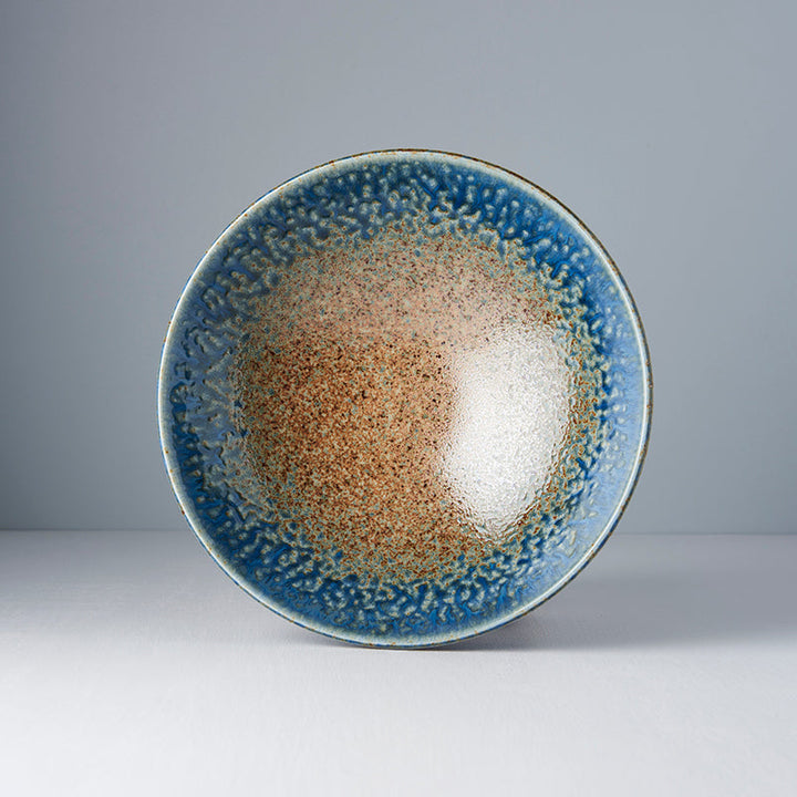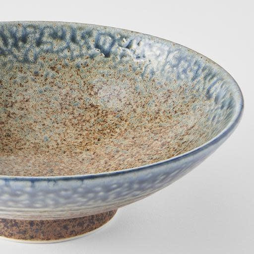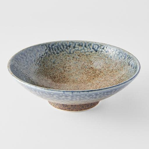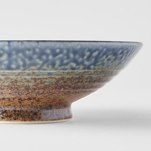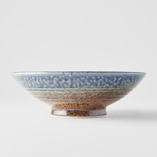 This ramen bowl has a wide, open shape with gently sloped sides and a sturdy, raised foot. Its generous size makes it ideal for holding plenty of broth and toppings The glaze is speckled with warm browns and soft cool tones. Glossy finish with visible rings inside, creating a natural, textured look. Slight irregularities in size, glaze and texture reflect the artisan nature of the product and are embraced.