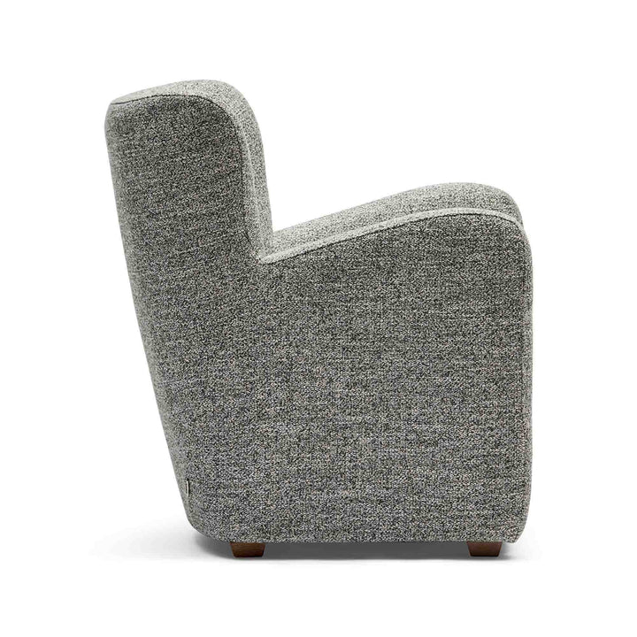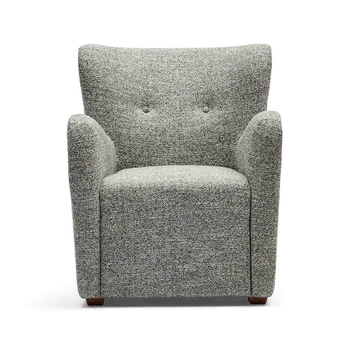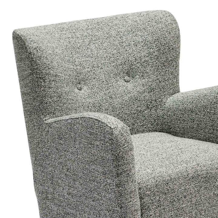 Sample Chair, limited stock. The Elio Occasional Chair with buttons. Inspired by classic Danish design, this chair features slimline padded arms & a subtle buttoned wingback for added flair & maximum comfort. Upholstered in a high-quality green and white weave, its solid structure and clean lines modernize the traditional style, while the soft supportive cushioning and beautiful rounded shape cradle your body as you relax. With solid timber feet, this charming armchair epitomizes sophistication and comfort in any setting