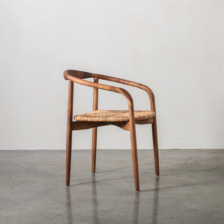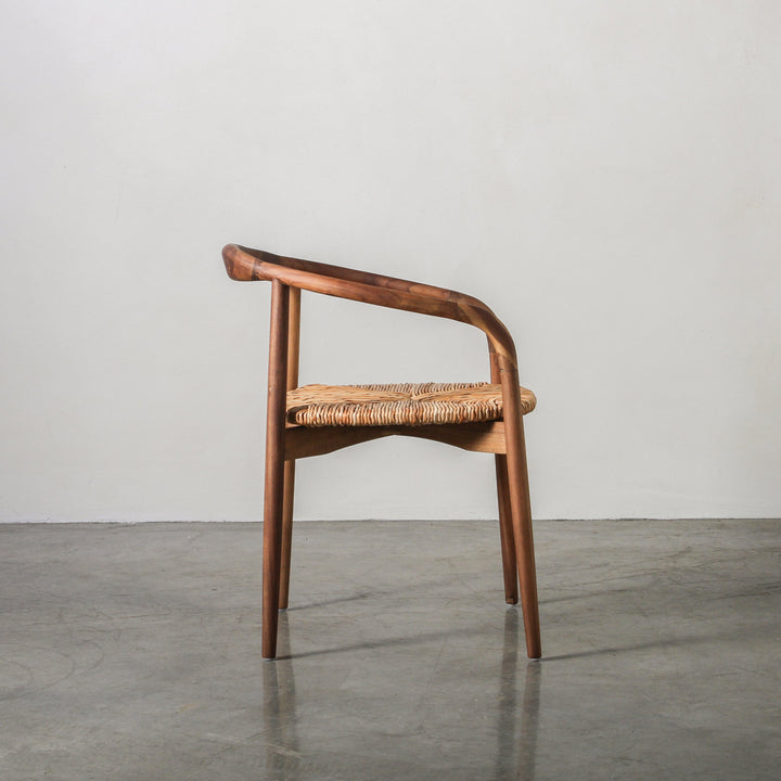 The Essence Dining Chair in Leaf Rope/Walnut represents a thoughtful synthesis of ergonomic design and natural material authenticity. Its curved Acacia wood frame in walnut finish provides structural support whilst the leaf rope seat introduces artisanal texture and organic warmth. The gentle arc of the wooden structure enhances postural comfort and establishes visual continuity, facilitating seamless integration across varied interior contexts. Natural wood grain contrasts subtly with the woven seat material, creating dimensional interest through material dialogue rather than ornamental excess. Proportioned with precision, this design prioritizes the interplay between tactile richness and functional reliability, offering a sophisticated seating solution for those valuing both aesthetic refinement and everyday practicality.