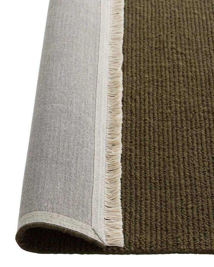 Fabien emphasizes a rich texture that is both visible and tactile. Made from 100% wool, its thick loop pile forms a pronounced ribbed pattern that enhances structure and depth in any environment. With a modest 1cm pile height, it maintains a sleek and grounded profile, while natural fringe details add a refined finishing touch. Combining varied pile heights with felted yarns, Fabien delivers a textured underfoot sensation that is neither overly soft nor flat, but instead warm, substantial, and full of character. Fabien in Moss brings a grounded, organic edge to interiors. Its medium-toned forest green hue is deep yet...
