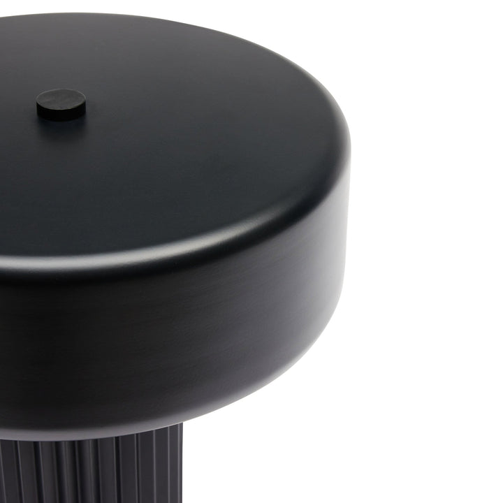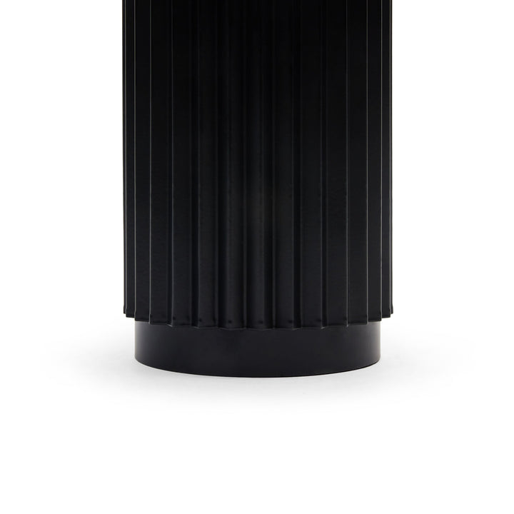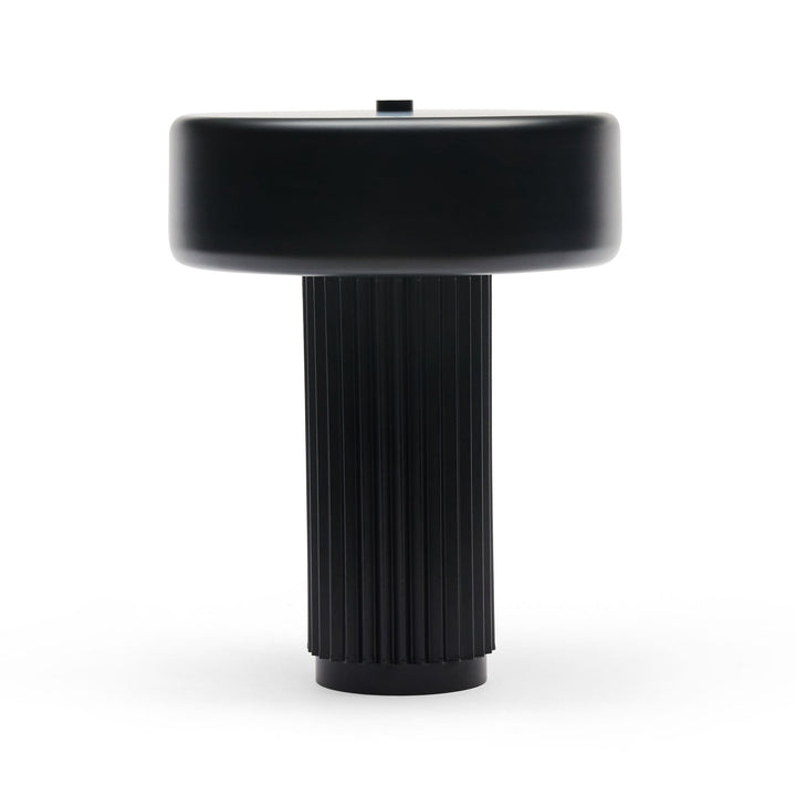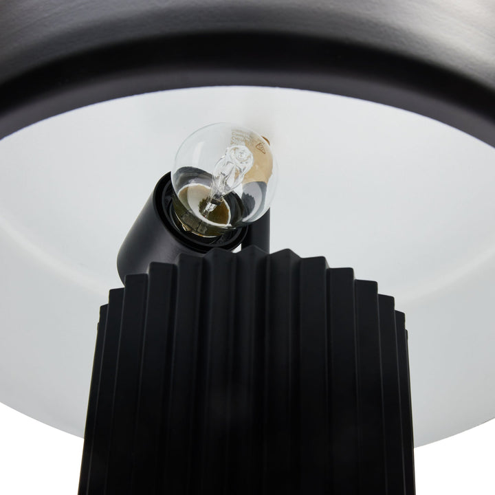 The Felix Table Lamp in black iron features a round flat metal shade and round corrugated base. The vertical lines & rivets are eye-catching while the diffused light casts a warm & inviting glow. The Felix Lamp is carefully designed to create a balanced & cohesive look. The black fabric cord has an in-line on & off switch. Uses 1 x E27 MAX 40W globe (not included).