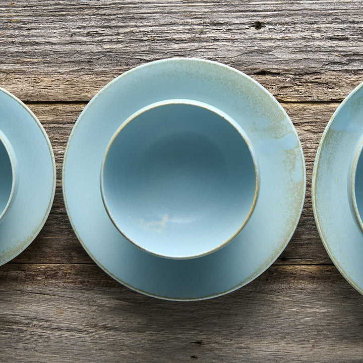 This 21cm plate features a smooth, gently sloped surface with a softly elevated rim that adds both function and elegance. Soda Blue glaze features a soft matte pastel blue, highlighted by gentle variations of white giving this range a smooth and modern finish. Slight irregularities in size, glaze and texture reflect the artisan nature of the product and are embraced.